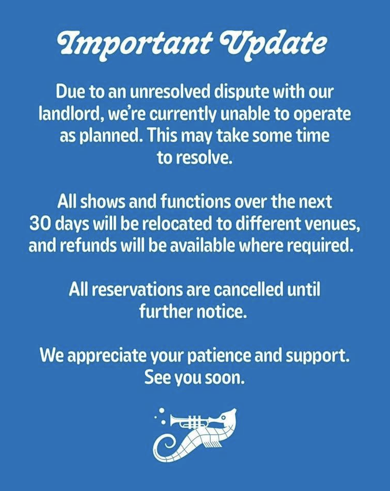 An update shared by the venue indicates that the shutdown is linked to an ongoing dispute with the landlord, with immediate impacts on bookings and events.