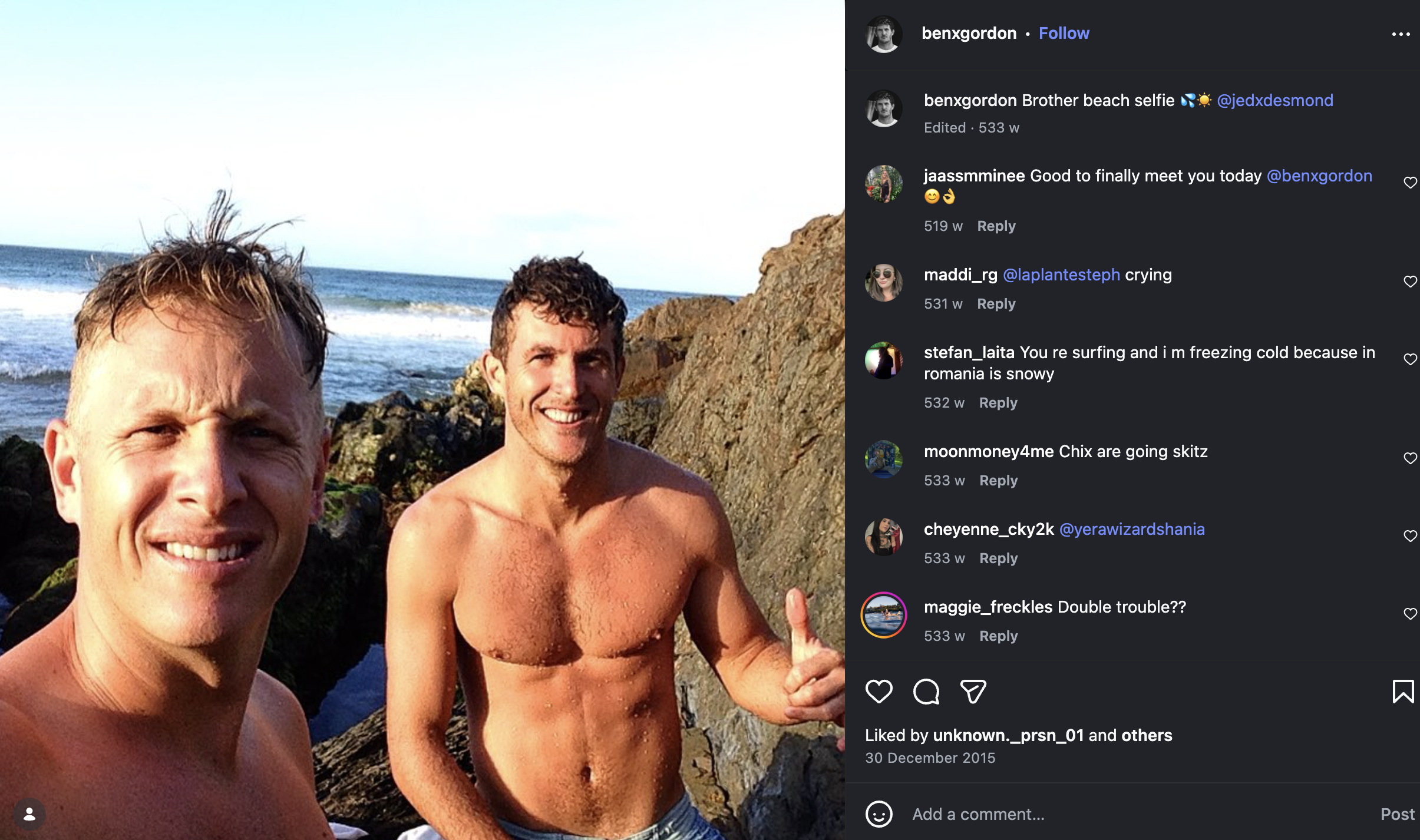 The post, shared from Gordon’s verified account in 2015, includes the caption “Brother beach selfie” and tags an account believed to belong to Jed Gordon. The image shows the two together at the beach and has begun circulating online as questions continue around the individual’s past connection to the band.
