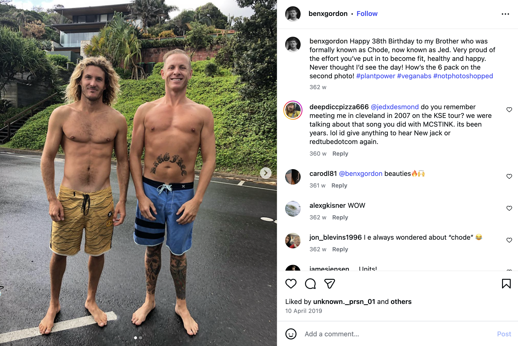 One post, shared from Gordon’s verified account in 2015, includes the caption “Brother beach selfie” and tags an account belonging to Jed Gordon. A separate post from 2019 explicitly refers to Jed as Gordon’s brother, removing any ambiguity around the relationship.