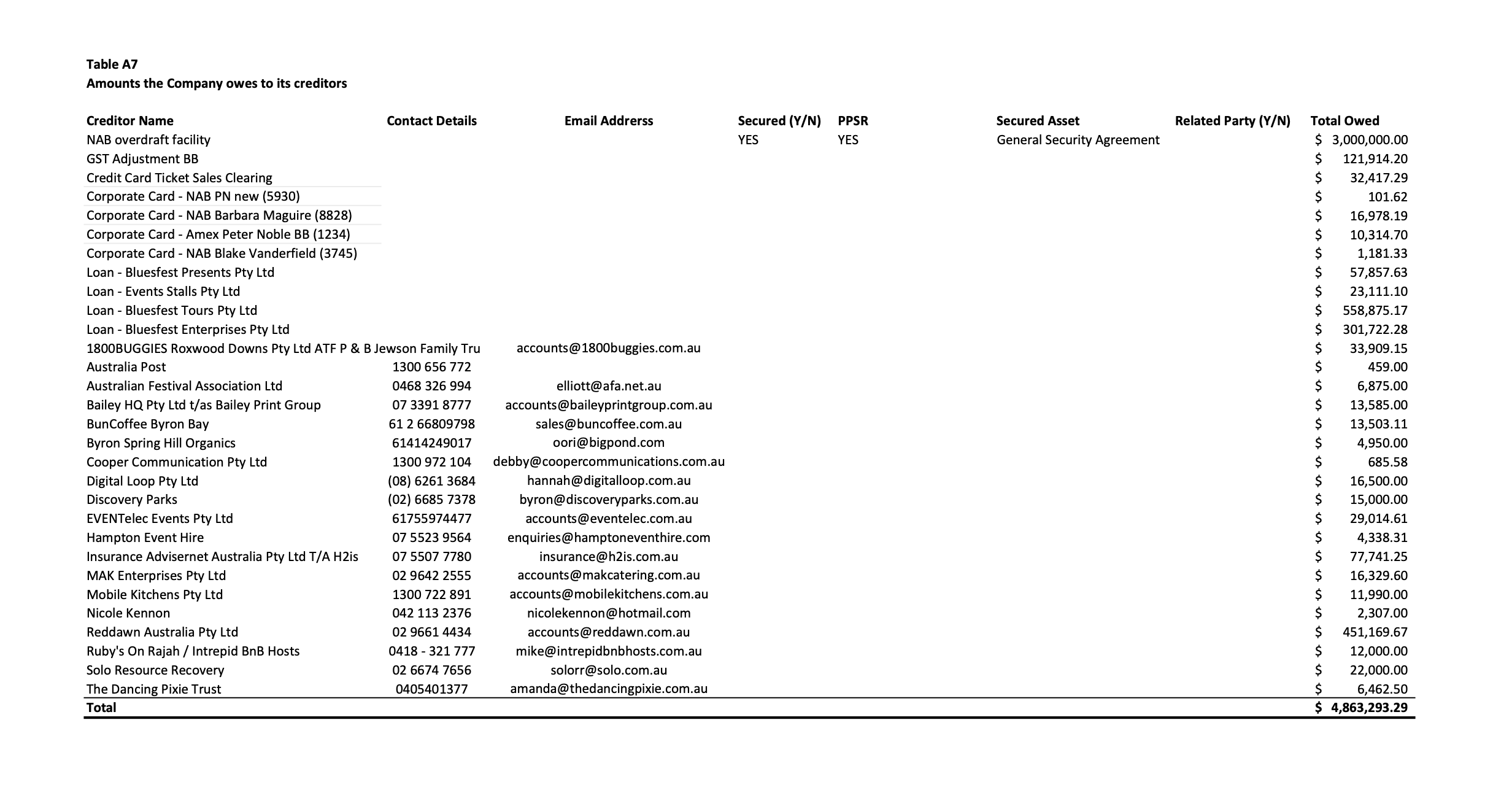 It relates to Bluesfest Byron Bay Pty Ltd, the company that actually ran the festival — paying suppliers, booking infrastructure and covering operational costs.