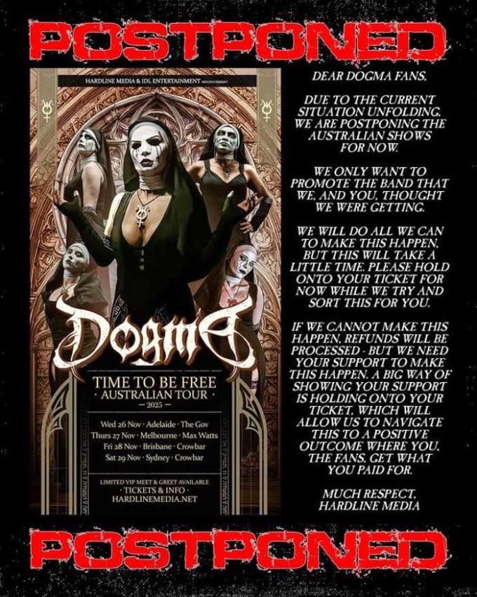Dogma’s upcoming Australian tour has been postponed by promoter Hardline Media amidst the ongoing accusations of manipulation and mistreatment from former members against the band’s management.