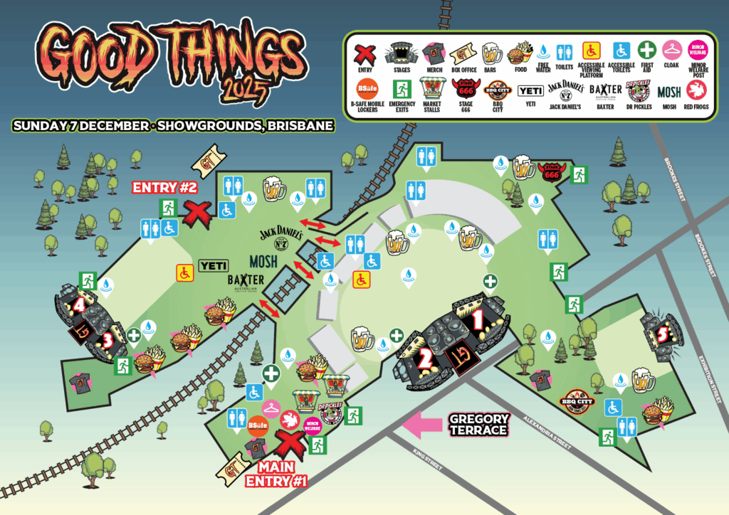 There are designated drop-off / rideshare / taxi zones on Greggory Terrace, and will be operational throughout the event day. However, the designated pick-up zone will be unavailable after Good Things wraps up due to the sheer amount of people spilling out onto the street. It’s recommended those wanting to catch an Uber/taxi/rideshare either make their way to the Valley to catch a ride, or make alternative arrangements to get home. Keep in mind you’re likely in for very long waits and high costs due to high demand.
