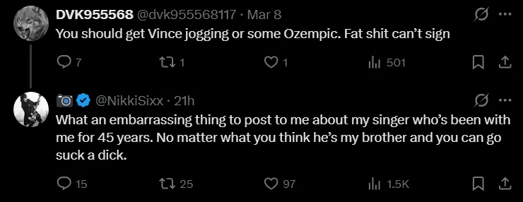The exchange played out on X (formerly Twitter) over the weekend after a user directed an insult at Sixx regarding the Crüe frontman, the post read: ‘You should get Vince jogging or some Ozempic. Fat sh*t can’t sing’ [sic]. (per Metal Injection)