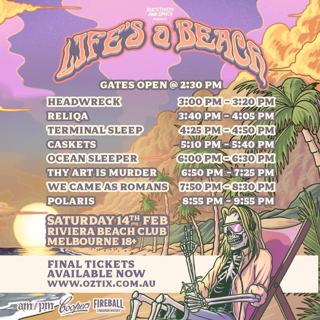 ‘Life’s A Beach’ is a one day Melbourne event headlined and curated by Polaris, stacking a proper mix of local hitters as well as some international punch, the lineup is stacked: We Came As Romans (USA), Thy Art Is Murder, Ocean Sleeper, Caskets (UK), Terminal Sleep, Reliqa, and Headwreck.